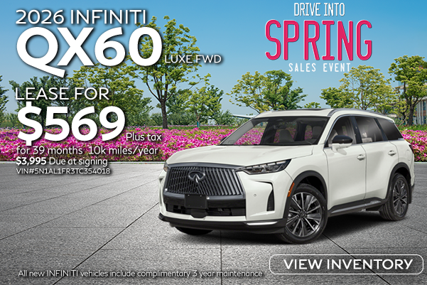 VIN# 5N1AL1FR3TC354018. 39-month lease, $3,995 due at signing. MSRP $59,865 Sale price cannot be combined with special lease or finance offers. Must finance through Coulter Infiniti Finance department. Excludes taxes, title, license, vehicle options, and $599 doc fee. No security deposit required. At lease end pay excess wear and use plus $0.25/mile for mileage over 10,000 miles/year. Offer Expires 04/30/2026