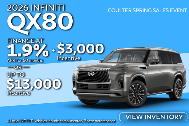0 % APR for 60 months plus $2,500 Incentive. 0% Example: $27.78 17.05 per $1,000 financed. OR up to $14,000 Incentive when purchased and finance at standard rates. Not all buyers may qualify. Higher rates apply for buyers with lower credit ratings. Sale price cannot be combined with special finance offers. Must finance through Coulter Infiniti Finance department. Offer Expires 03/31/2026.