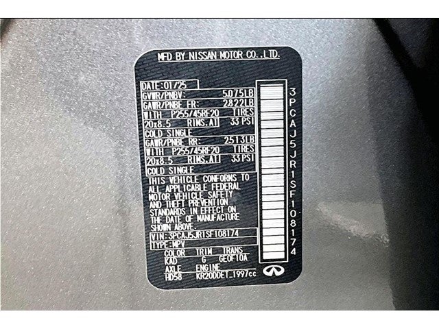 INFINITI Certified Pre-Owned, AM/FM radio: SiriusXM, Black Film Rear Bumper Protector, Brake assist, Cargo Net, Cargo Package, Front fog lights, Leather steering wheel, Low tire pressure warning, Power door mirrors, Power Liftgate, Power moonroof, Power windows, Reversible Cargo Mat, Speed-sensing steering, Variably intermittent wipers. CVT