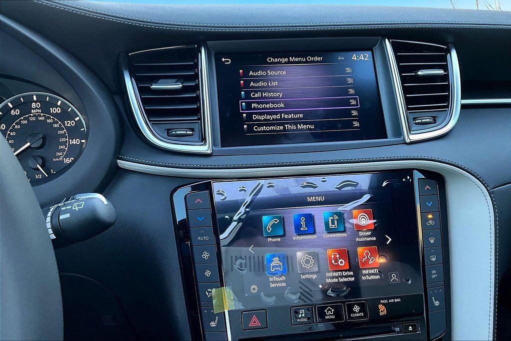 - Radio: AM/FM Audio System -inc: 6 speakers, INFINITI InTouch dual display system w/upper 8" and lower 7" touch screens, wireless Apple CarPlay, Android Auto, HD Radio technology, SiriusXM radio w/advanced audio features and 90-day complimentary trial, INFINITI voice recognition, INFINITI InTouch services, Siri eyes free and Wi-Fi hotspot